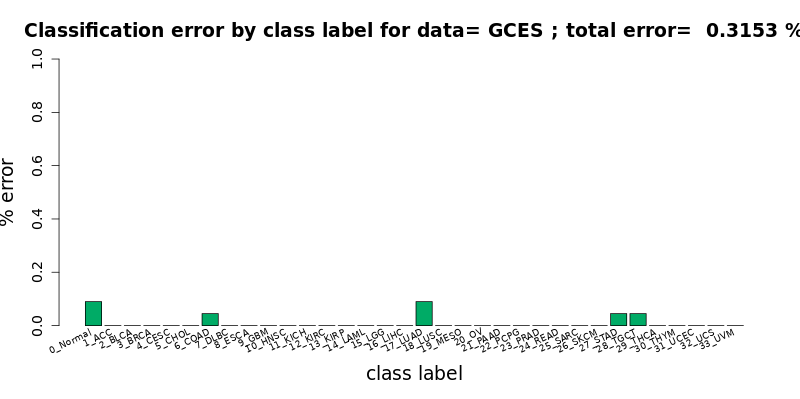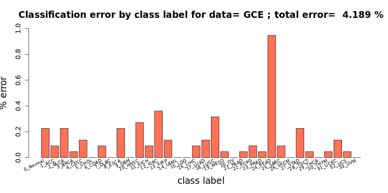 [user@cn4466 ~]$ cat results/chebnet.gce.D_0.1.tsv #class incorr total %err type 0 5 146 3.425 0_Normal 1 2 19 10.526 1_ACC 2 5 84 5.952 2_BLCA 3 1 226 0.442 3_BRCA 4 3 67 4.478 4_CESC 5 0 5 0.000 5_CHOL 6 2 77 2.597 6_COAD 7 0 7 0.000 7_DLBC 8 5 30 16.667 8_ESCA 9 0 33 0.000 9_GBM 10 6 92 6.522 10_HNSC 11 2 12 16.667 11_KICH 12 8 115 6.957 12_KIRC 13 3 51 5.882 13_KIRP 14 0 43 0.000 14_LAML 15 0 107 0.000 15_LGG 16 2 76 2.632 16_LIHC 17 3 109 2.752 17_LUAD 18 7 103 6.796 18_LUSC 19 1 25 4.000 19_MESO 20 0 83 0.000 20_OV 21 1 23 4.348 21_PAAD 22 2 46 4.348 22_PCPG 23 1 86 1.163 23_PRAD 24 21 36 58.333 24_READ 25 2 44 4.545 25_SARC 26 0 93 0.000 26_SKCM 27 5 78 6.410 27_STAD 28 1 18 5.556 28_TGCT 29 0 109 0.000 29_THCA 30 1 20 5.000 30_THYM 31 3 122 2.459 31_UCEC 32 1 14 7.143 32_UCS 33 0 21 0.000 33_UVM # Finally: num_corr=2127 / 2220, error= 4.189189 % # # 0_Normal -> 2_BLCA: 1 (0.045045 %) # 0_Normal -> 12_KIRC: 1 (0.045045 %) # 0_Normal -> 15_LGG: 1 (0.045045 %) # 0_Normal -> 23_PRAD: 1 (0.045045 %) # 0_Normal -> 27_STAD: 1 (0.045045 %) # 1_ACC -> 2_BLCA: 2 (0.090090 %) # 2_BLCA -> 4_CESC: 3 (0.135135 %) # 2_BLCA -> 10_HNSC: 1 (0.045045 %) # 2_BLCA -> 18_LUSC: 1 (0.045045 %) # 3_BRCA -> 0_Normal: 1 (0.045045 %) # 4_CESC -> 6_COAD: 1 (0.045045 %) # 4_CESC -> 31_UCEC: 2 (0.090090 %) # 6_COAD -> 24_READ: 2 (0.090090 %) # 8_ESCA -> 27_STAD: 5 (0.225225 %) # 10_HNSC -> 0_Normal: 1 (0.045045 %) # 10_HNSC -> 4_CESC: 3 (0.135135 %) # 10_HNSC -> 18_LUSC: 1 (0.045045 %) # 10_HNSC -> 25_SARC: 1 (0.045045 %) # 11_KICH -> 12_KIRC: 1 (0.045045 %) # 11_KICH -> 13_KIRP: 1 (0.045045 %) # 12_KIRC -> 0_Normal: 1 (0.045045 %) # 12_KIRC -> 2_BLCA: 1 (0.045045 %) # 12_KIRC -> 11_KICH: 1 (0.045045 %) # 12_KIRC -> 13_KIRP: 3 (0.135135 %) # 12_KIRC -> 16_LIHC: 1 (0.045045 %) # 12_KIRC -> 25_SARC: 1 (0.045045 %) # 13_KIRP -> 2_BLCA: 2 (0.090090 %) # 13_KIRP -> 12_KIRC: 1 (0.045045 %) # 16_LIHC -> 0_Normal: 1 (0.045045 %) # 16_LIHC -> 5_CHOL: 1 (0.045045 %) # 17_LUAD -> 18_LUSC: 2 (0.090090 %) # 17_LUAD -> 31_UCEC: 1 (0.045045 %) # 18_LUSC -> 2_BLCA: 1 (0.045045 %) # 18_LUSC -> 10_HNSC: 2 (0.090090 %) # 18_LUSC -> 17_LUAD: 3 (0.135135 %) # 18_LUSC -> 21_PAAD: 1 (0.045045 %) # 19_MESO -> 25_SARC: 1 (0.045045 %) # 21_PAAD -> 25_SARC: 1 (0.045045 %) # 22_PCPG -> 0_Normal: 1 (0.045045 %) # 22_PCPG -> 21_PAAD: 1 (0.045045 %) # 23_PRAD -> 0_Normal: 1 (0.045045 %) # 24_READ -> 6_COAD: 21 (0.945946 %) # 25_SARC -> 16_LIHC: 1 (0.045045 %) # 25_SARC -> 32_UCS: 1 (0.045045 %) # 27_STAD -> 8_ESCA: 4 (0.180180 %) # 27_STAD -> 28_TGCT: 1 (0.045045 %) # 28_TGCT -> 29_THCA: 1 (0.045045 %) # 30_THYM -> 10_HNSC: 1 (0.045045 %) # 31_UCEC -> 12_KIRC: 1 (0.045045 %) # 31_UCEC -> 20_OV: 1 (0.045045 %) # 31_UCEC -> 32_UCS: 1 (0.045045 %) # 32_UCS -> 31_UCEC: 1 (0.045045 %) # 33_UVM -> 26_SKCM: 1 (0.045998 %)Here, the label 0 corresponds to the Normal samples, and the following abbreviations have been used to designate the 33 tumor types, with labels 1 to 33: