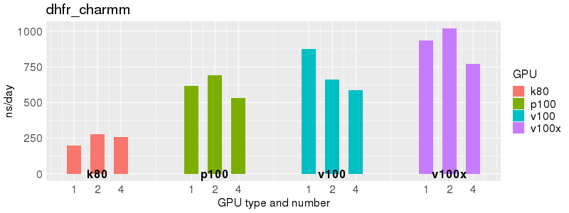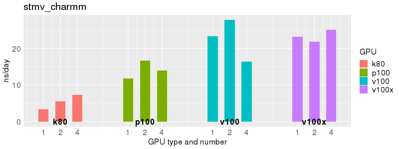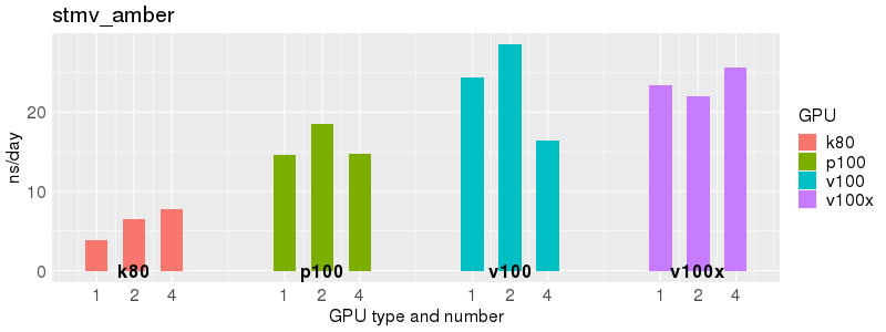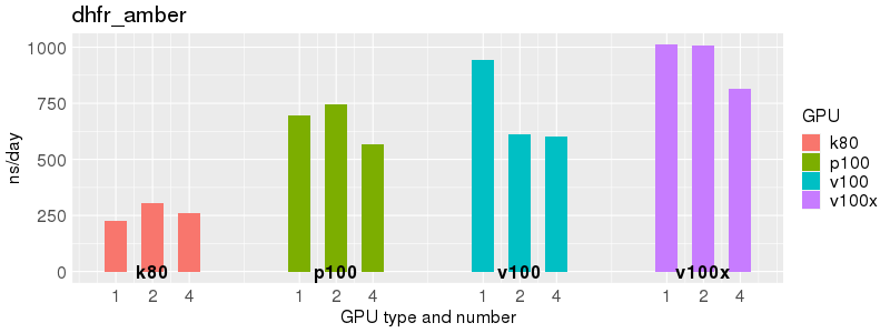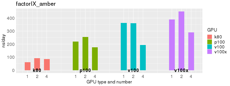 Based on these benchmarks, there is a significant performance advantage to the v100 and v100x over the p100 and k80 GPUs. However, in most cases there is no advantage to using more than 1 GPU of any type. Before allocating multiple GPUs for your own Acemd jobs, please run your own benchmarks to verify that the additional GPUs are providing a performance improvement for your jobs. (and please send any interesting results to staff@hpc.nih.gov).
