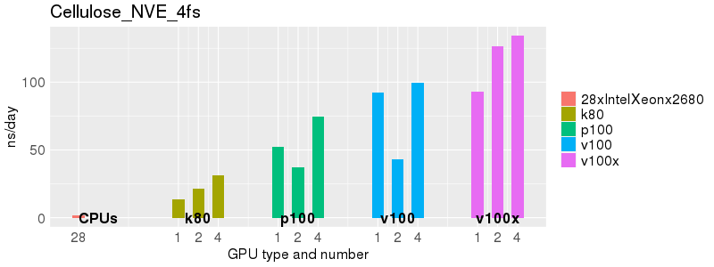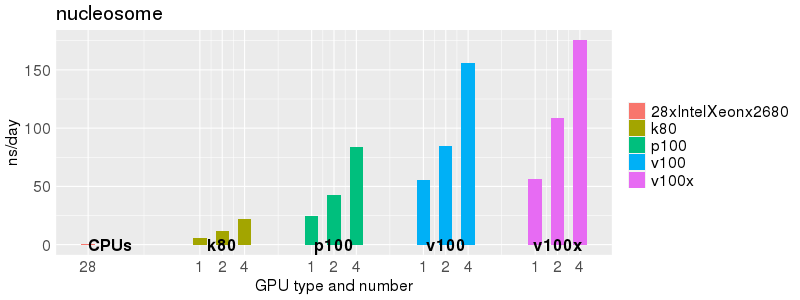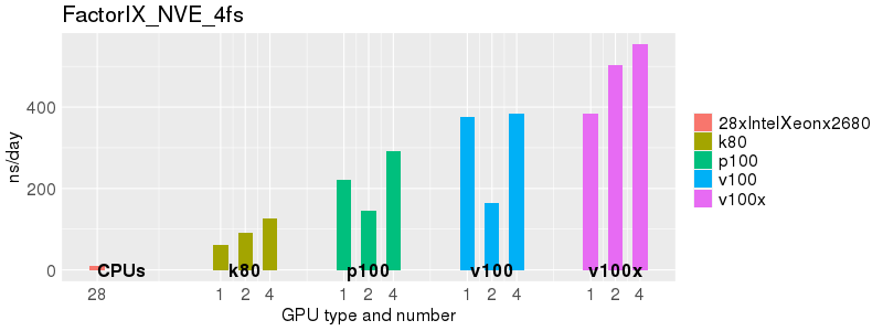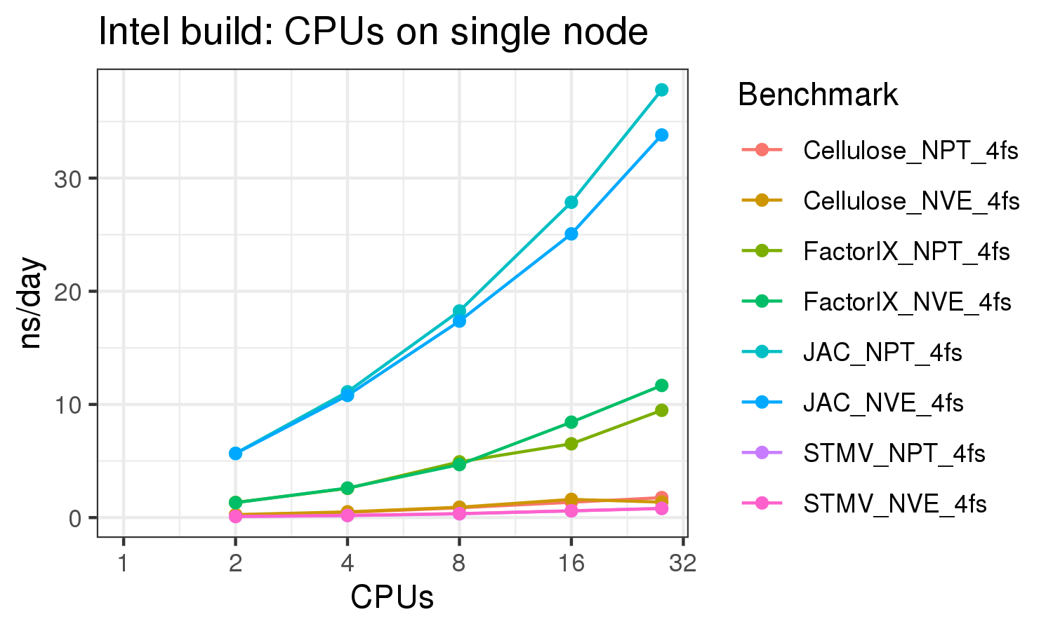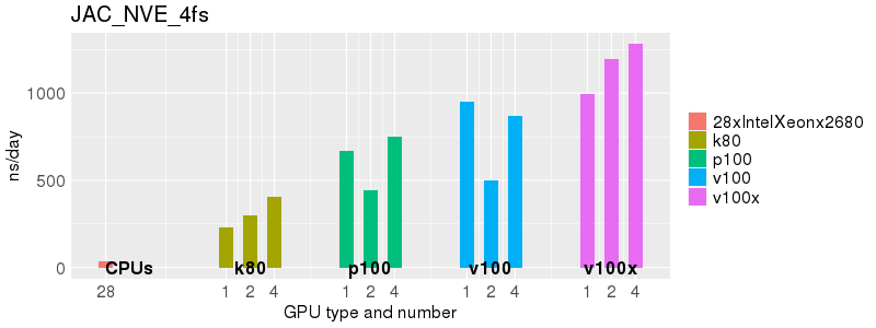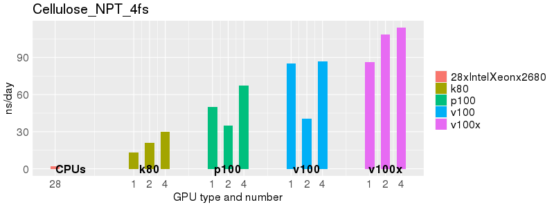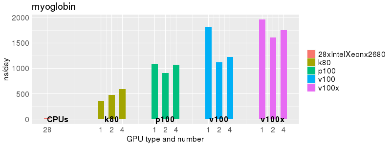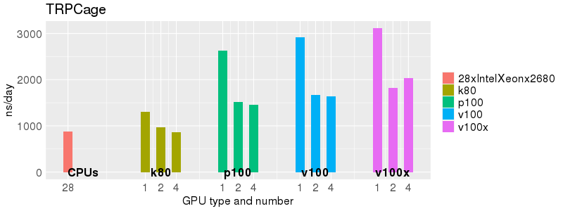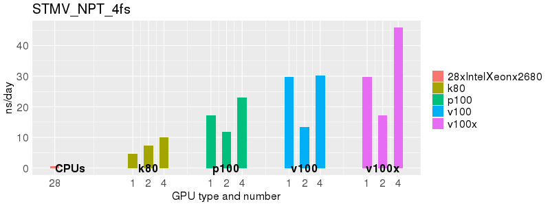The benchmark above was run on a Intel Xeon E5-2680 v4 @2.5GHz with 28 cores (56 hyperthreaded cores). As with other MD applications, the performance drops when more than 28 MPI processes (i.e. 1 process per physical core) are run. Thus, if running on CPUs, it is important to use the '--ntasks-per-core=1' flag when submitting the job, to ensure that only 1 MPI process is run on each physical core. If it is possible to run on a GPU node, you will get significantly better performance as shown in the benchmarks below.