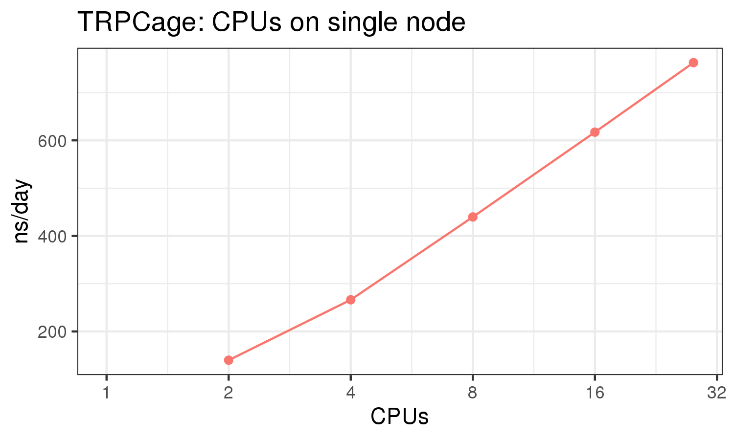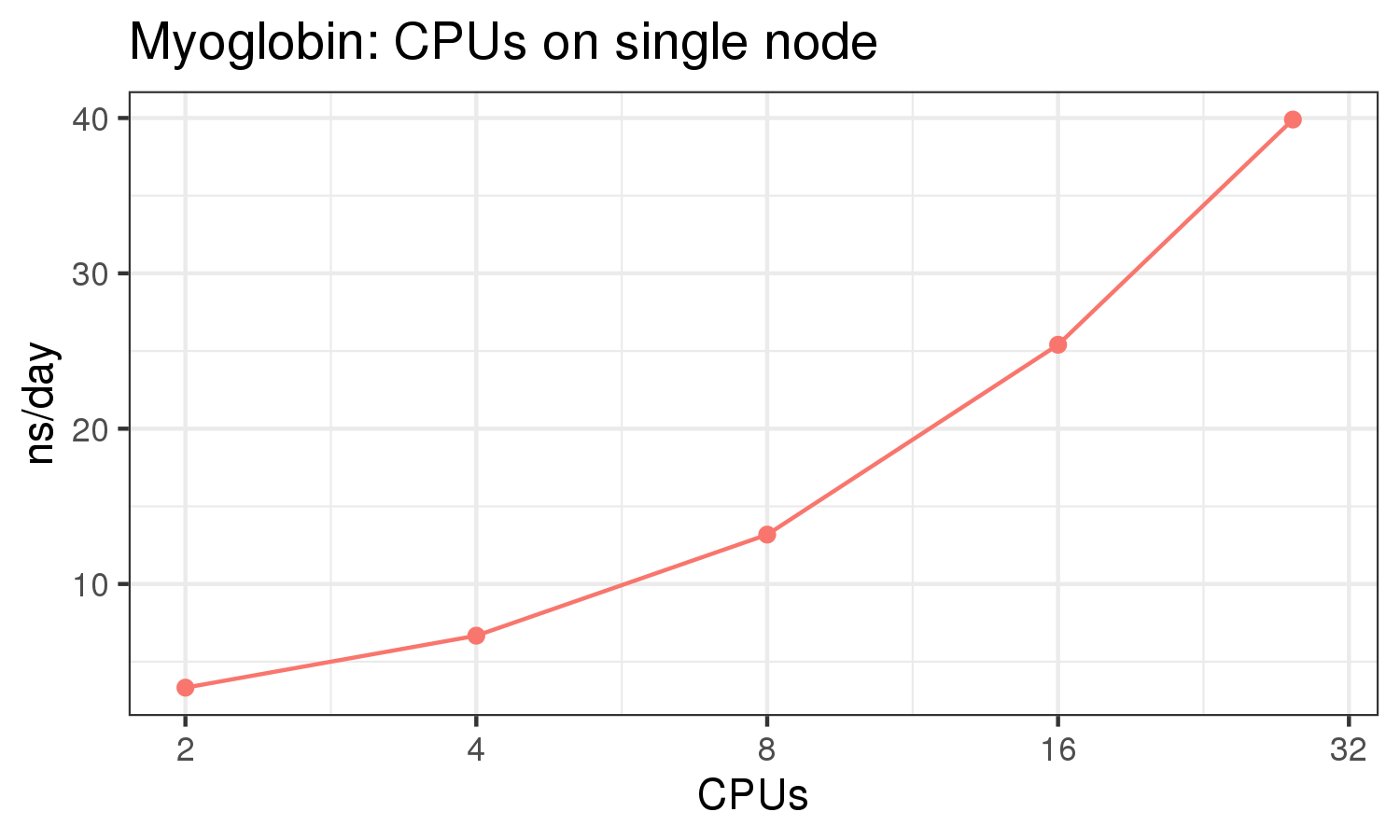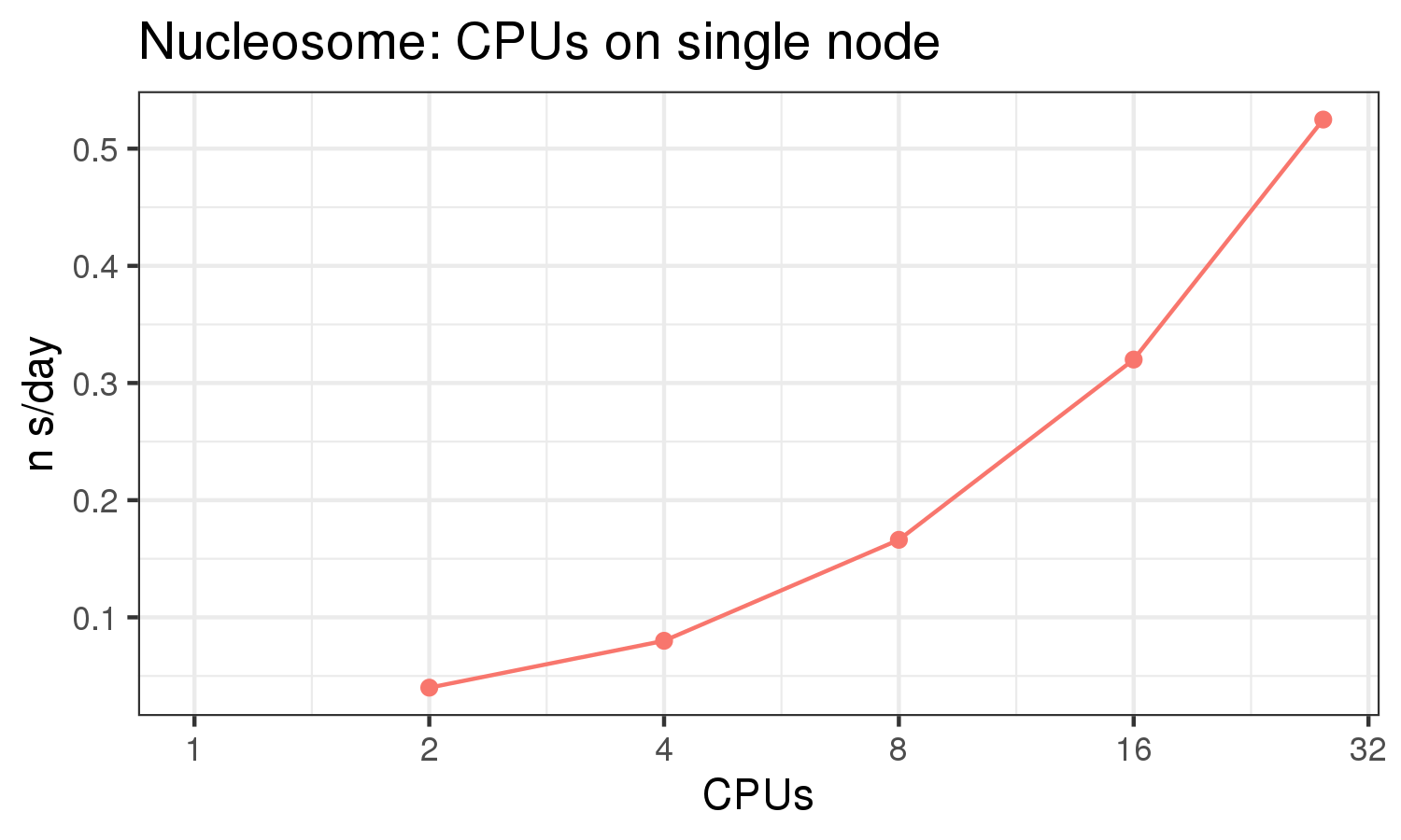 The benchmark above was run on a Intel Xeon E5-2680 v4 @2.5GHz with 28 cores (56 hyperthreaded cores). As with other MD applications, the performance drops when more than 28 MPI processes (i.e. 1 process per physical core) are run. Thus, if running on CPUs, it is important to use the '--ntasks-per-core=1' flag when submitting the job, to ensure that only 1 MPI process is run on each physical core. If it is possible to run on a GPU node, you will get significantly better performance as shown in the benchmarks below.
