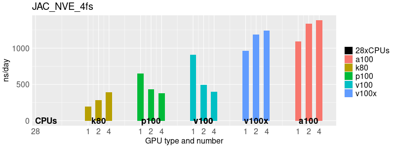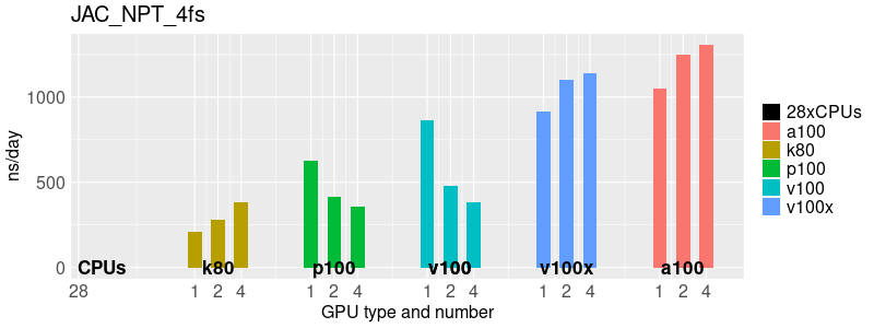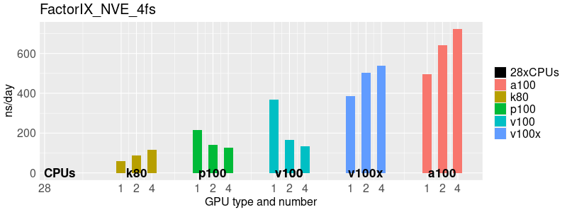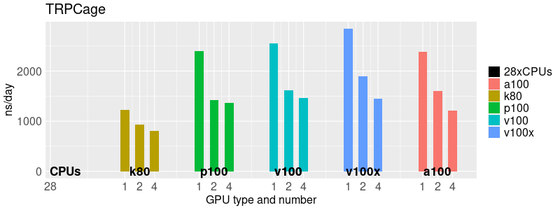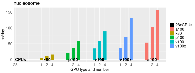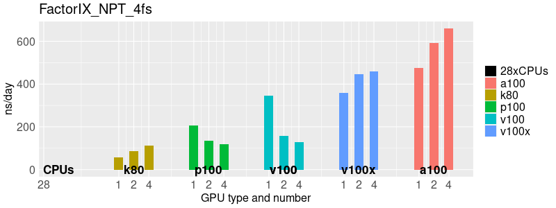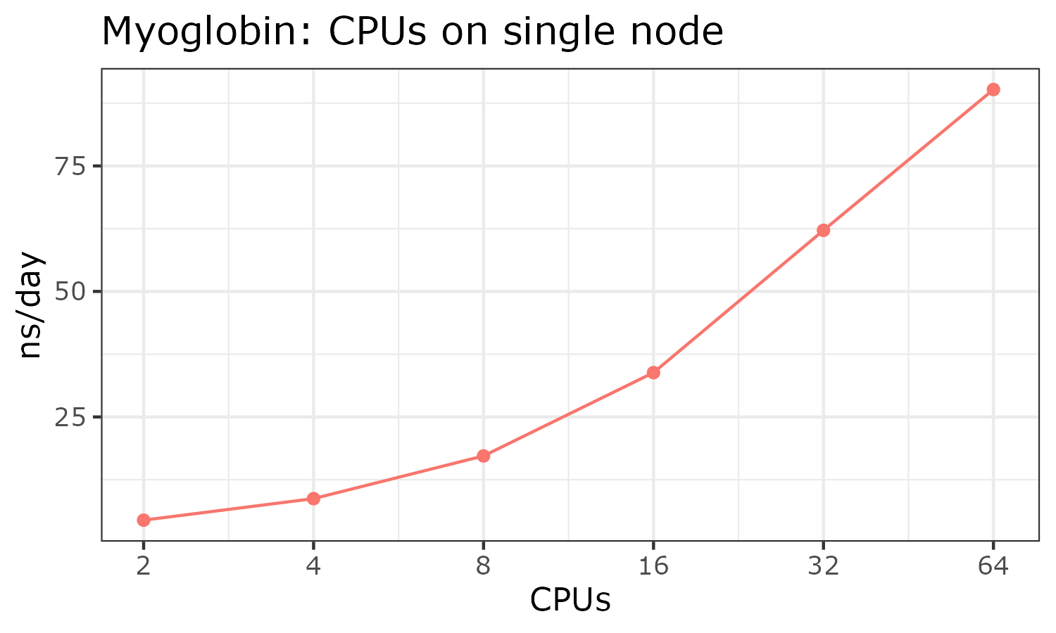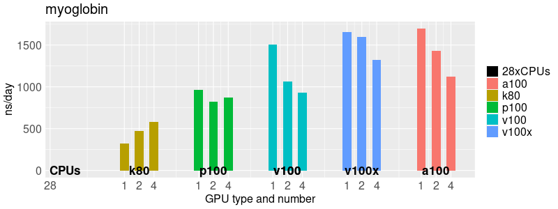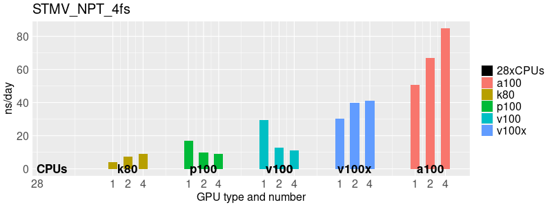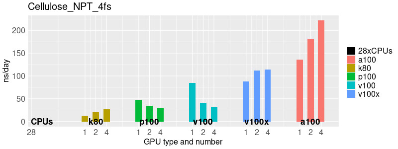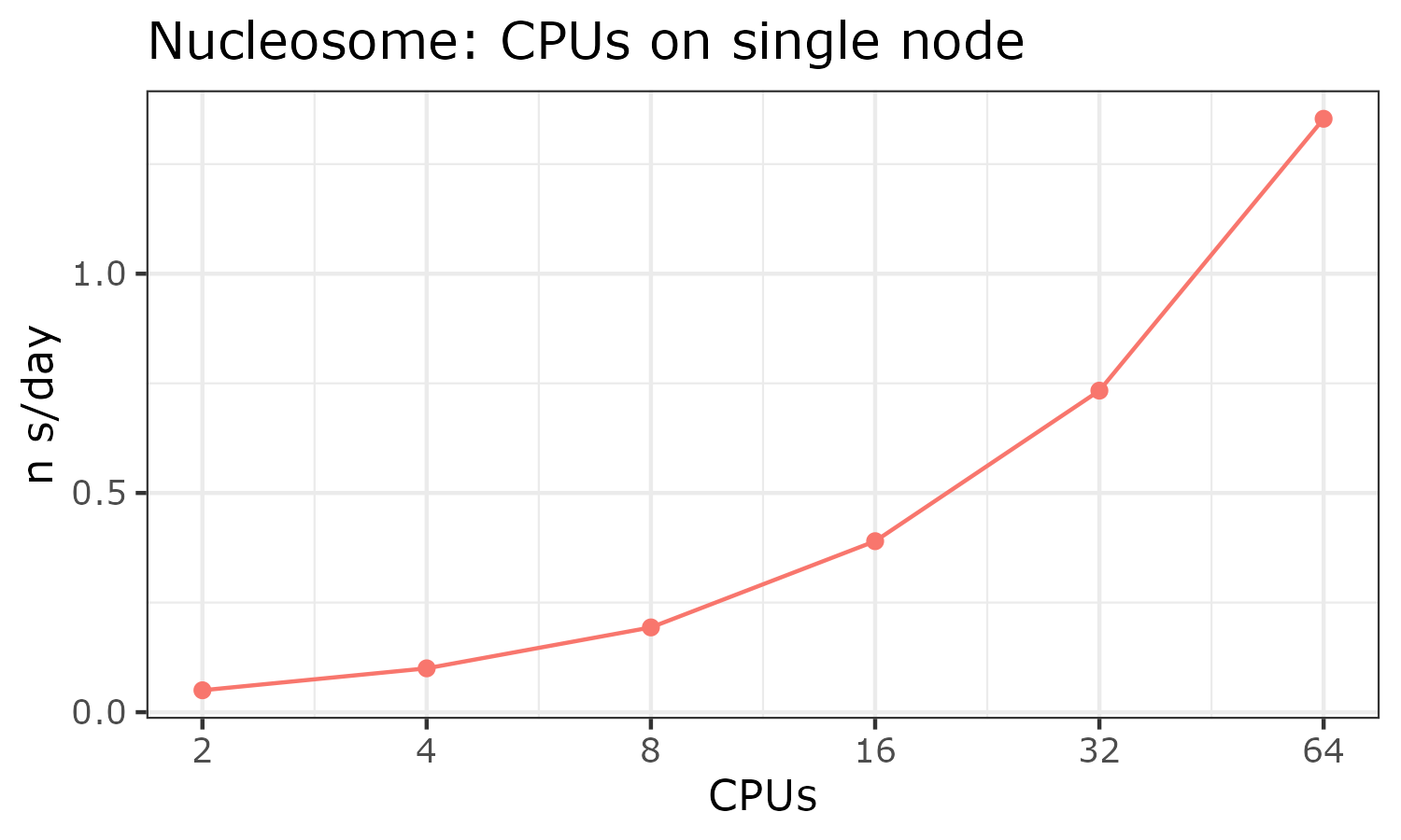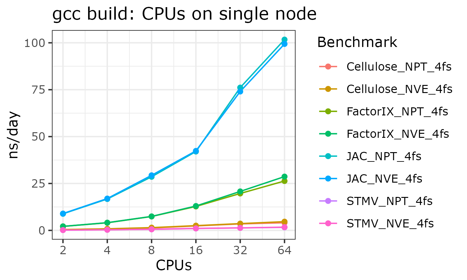 The benchmark above was run on a AMD Epyc 7543 @2.8GHz with 64 cores (128 hyperthreaded cores). As with other MD applications, the performance drops when more than 64 MPI processes (i.e. 1 process per physical core) are run. Thus, if running on CPUs, it is important to use the '--ntasks-per-core=1' flag when submitting the job, to ensure that only 1 MPI process is run on each physical core. If it is possible to run on a GPU node, you will get significantly better performance as shown in the benchmarks below.
