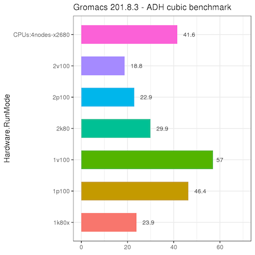 The following benchmark uses the adh_cubic job from the Gromacs GPU documentation. Please read the discussion on that page about GPU acceleration.
