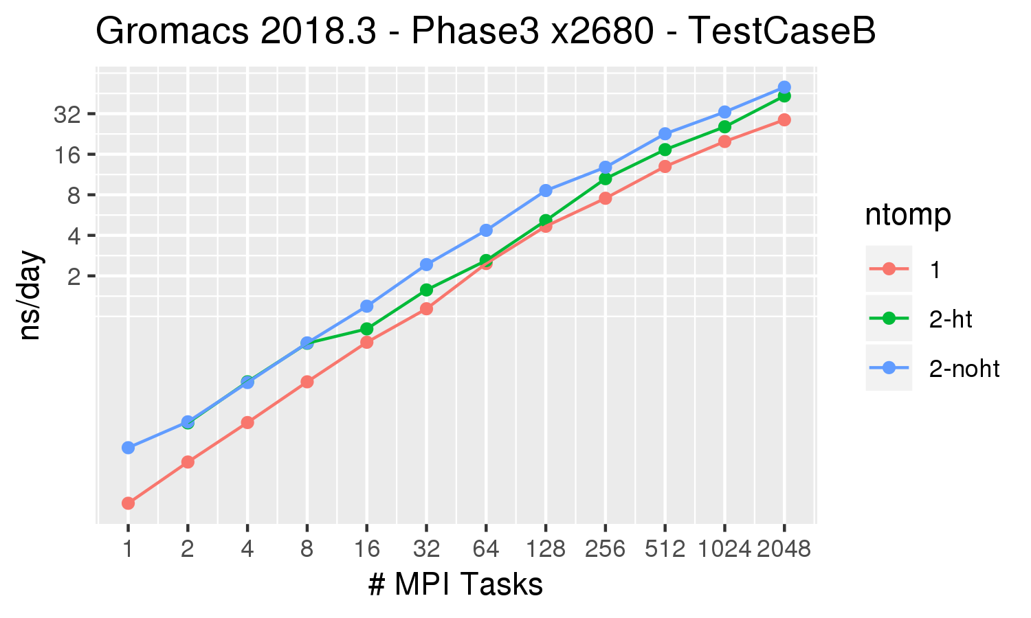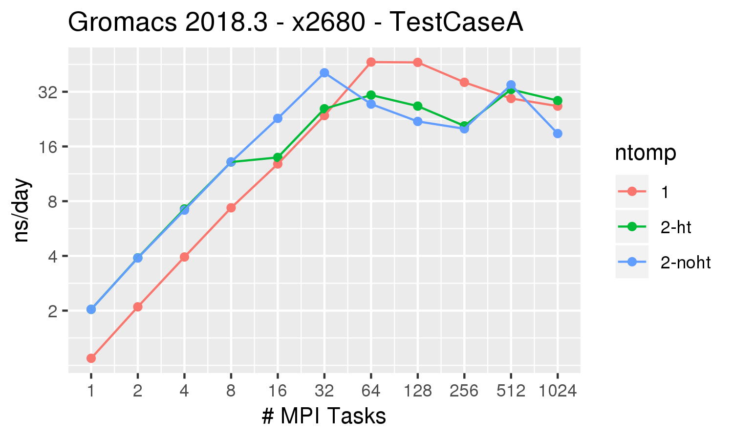 | ntomp = 2-ht | green line | 2 threads per MPI task, hyperthreading enabled. This effectively uses the same number of cores as ntomp=1, but uses both hyperthreaded CPUs on each core |