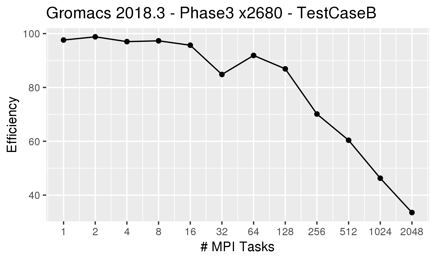 | The efficiency plot on the left for the all-MPI (ntomp=1) runs indicate that the efficiency drops below 70% for more than 16 MPI tasks. If running on the Phase 3 x2680 nodes,
