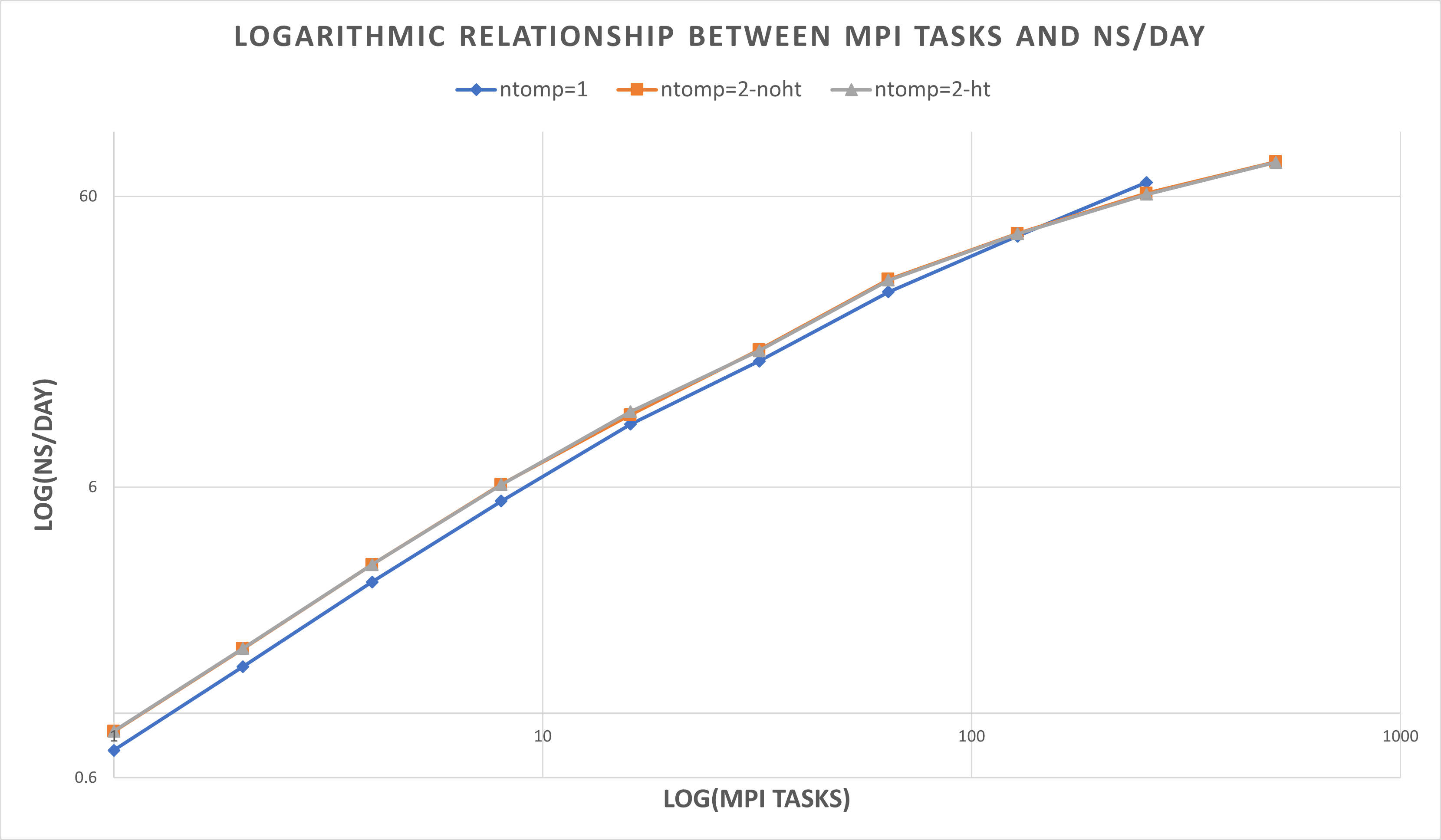 | ntomp = 2-ht | grey line | 2 threads per MPI task, hyperthreading enabled. This effectively uses the same number of cores as ntomp=1, but uses both hyperthreaded CPUs on each core. |