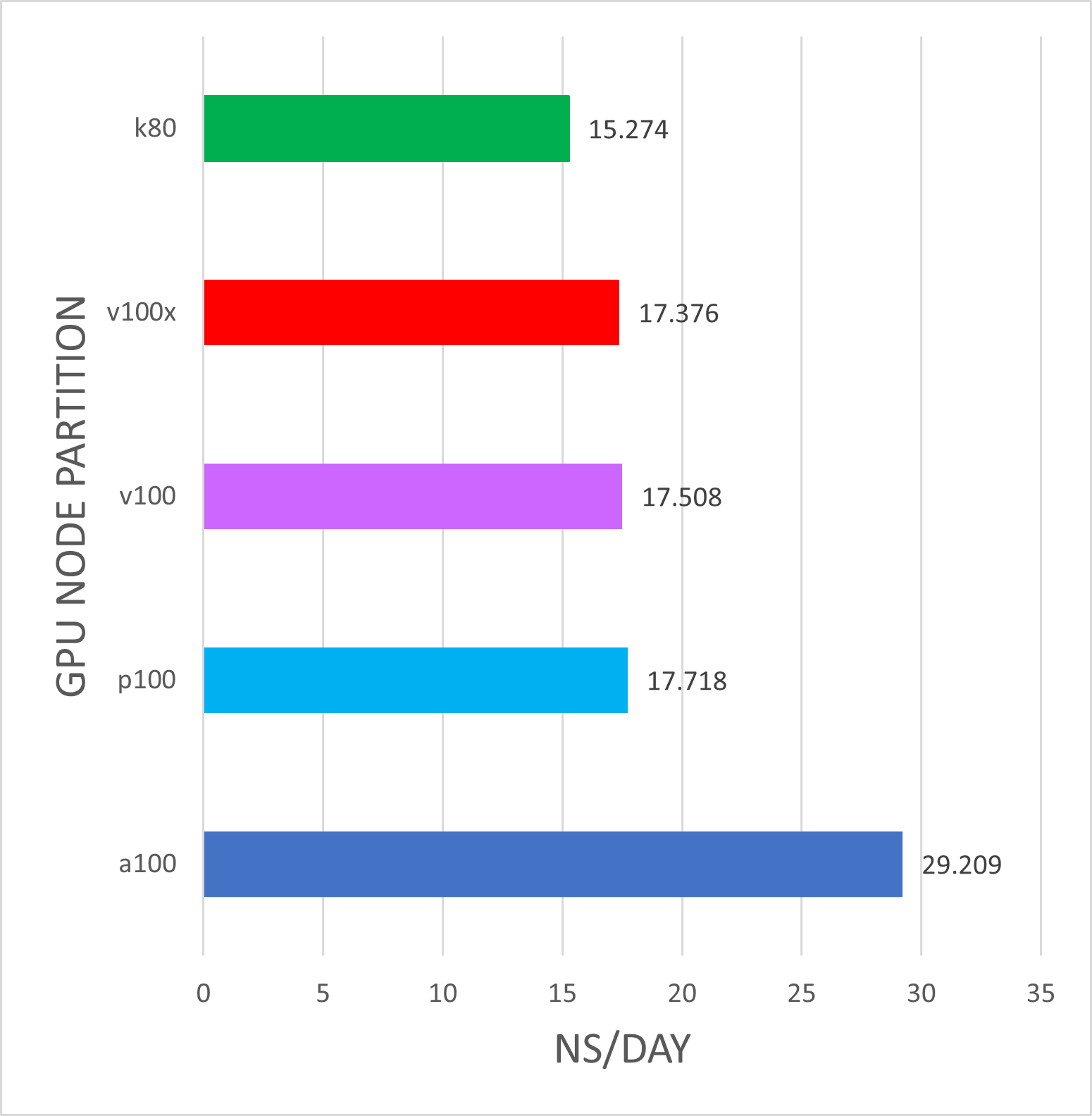 sbatch --partition=gpu \ --gres=gpu:xxx:1 --ntasks=2 \ --ntasks-per-core=1 --exclusive jobscript For this benchmark, there is a significant advantage to running Gromacs a100 nodes over k80 nodes. There is typically no advantage to running on more than a single GPU device. Single-GPU jobs were run on a single GPU with ntasks=2, n-tasks-per-core=1, and ntomp=2. These results may be different for larger molecular systems, so please run your own benchmarks to verify that your jobs benefit from the GPUs (and send us any interesting results!)