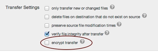 In our tests, compared to setting no parameters: Setting the 'Verify file integrity after transfer' (the default setting) added ~25% to the transfer time. Setting the 'Encrypt transfer' parameter added ~13% to the transfer time. Setting both Verify + Encrypt added 40% to the transfer time.
