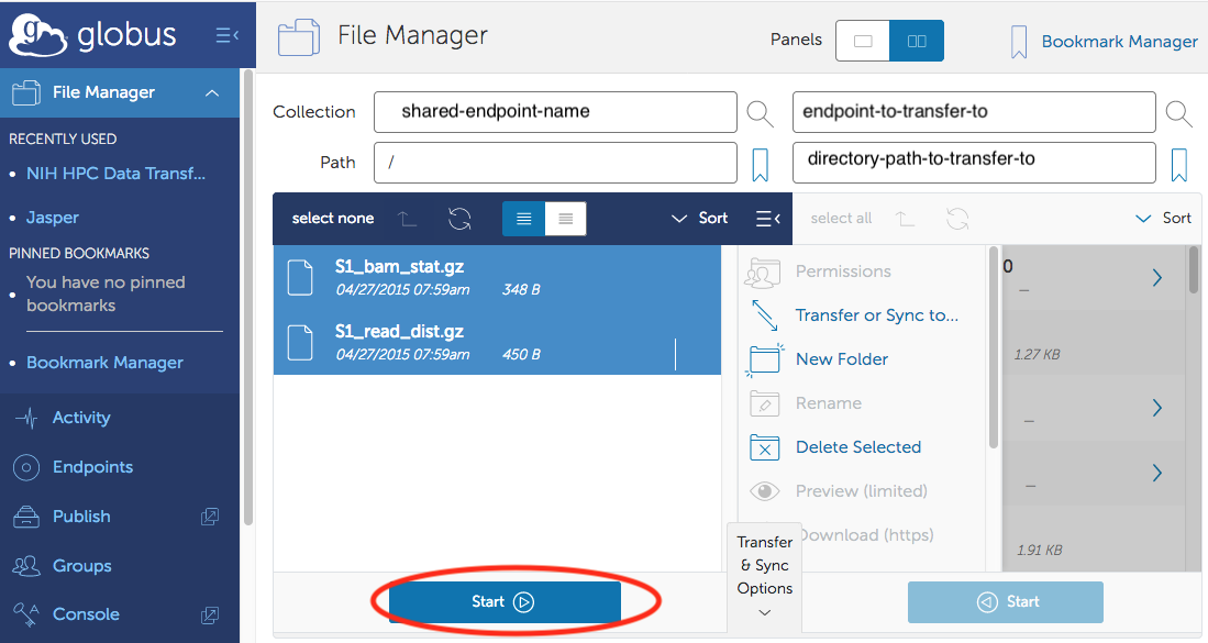 - You will need a Globus Plus license to do this. Email staff@hpc.nih.gov to get one.