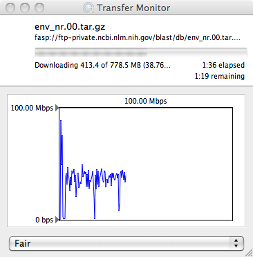 helix% ftp ftp.ncbi.nlm.nih.gov Connected to ftp.wip.ncbi.nlm.nih.gov. 220- Warning Notice! [...] --- Welcome to the NCBI ftp server! The official anonymous access URL is ftp://ftp.ncbi.nih.gov Public data may be downloaded by logging in as "anonymous" using your E-mail address as a password. Please see ftp://ftp.ncbi.nih.gov/README.ftp for hints on large file transfers 220 FTP Server ready. 500 AUTH not understood 500 AUTH not understood KERBEROS_V4 rejected as an authentication type Name (ftp.ncbi.nlm.nih.gov:user): anonymous 331 Anonymous login ok, send your complete email address as your password. Password: 230 Anonymous access granted, restrictions apply. Remote system type is UNIX. Using binary mode to transfer files. ftp> cd blast/db/ 250 CWD command successful ftp> get wgs.58.tar.gz local: wgs.58.tar.gz remote: wgs.58.tar.gz 227 Entering Passive Mode (130,14,29,30,195,228) 150 Opening BINARY mode data connection for wgs.58.tar.gz (983101055 bytes) 226 Transfer complete. 983101055 bytes received in 1.3e+02 seconds (7.7e+03 Kbytes/s) ftp> quit 221 Goodbye. helix%