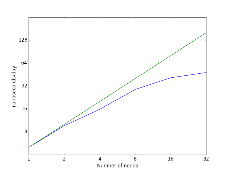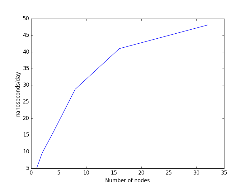 | Number of nodes | Number of cores | Nanoseconds per day |