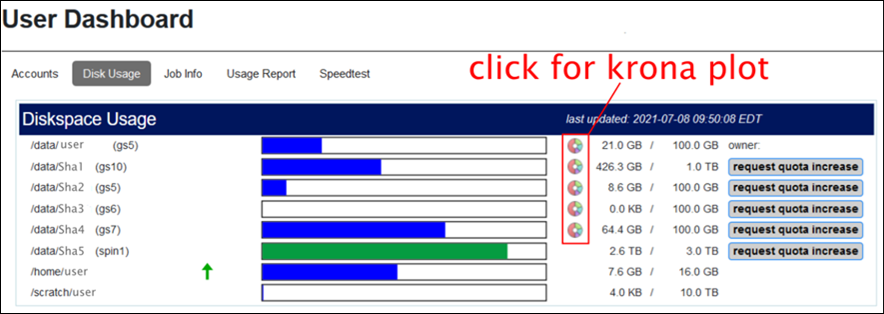 NOTE: Historical traces of disk usage and file counts are available through the User Dashboard.