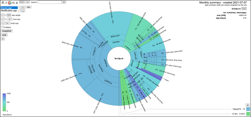 Below is a sample krona plot of a data directory. The size of the slices represents the total size of a directory and the color indicates the size-weighted mean age (access or modification) of the files in the directory. The plots on the dashboard are browsable with summary statistics shown in the top right corner.