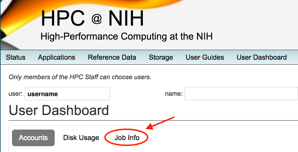 Point your web browser to https://hpc.nih.gov/dashboard. You will need to log in with your NIH username and password. Click on the 'Job Info' tab.