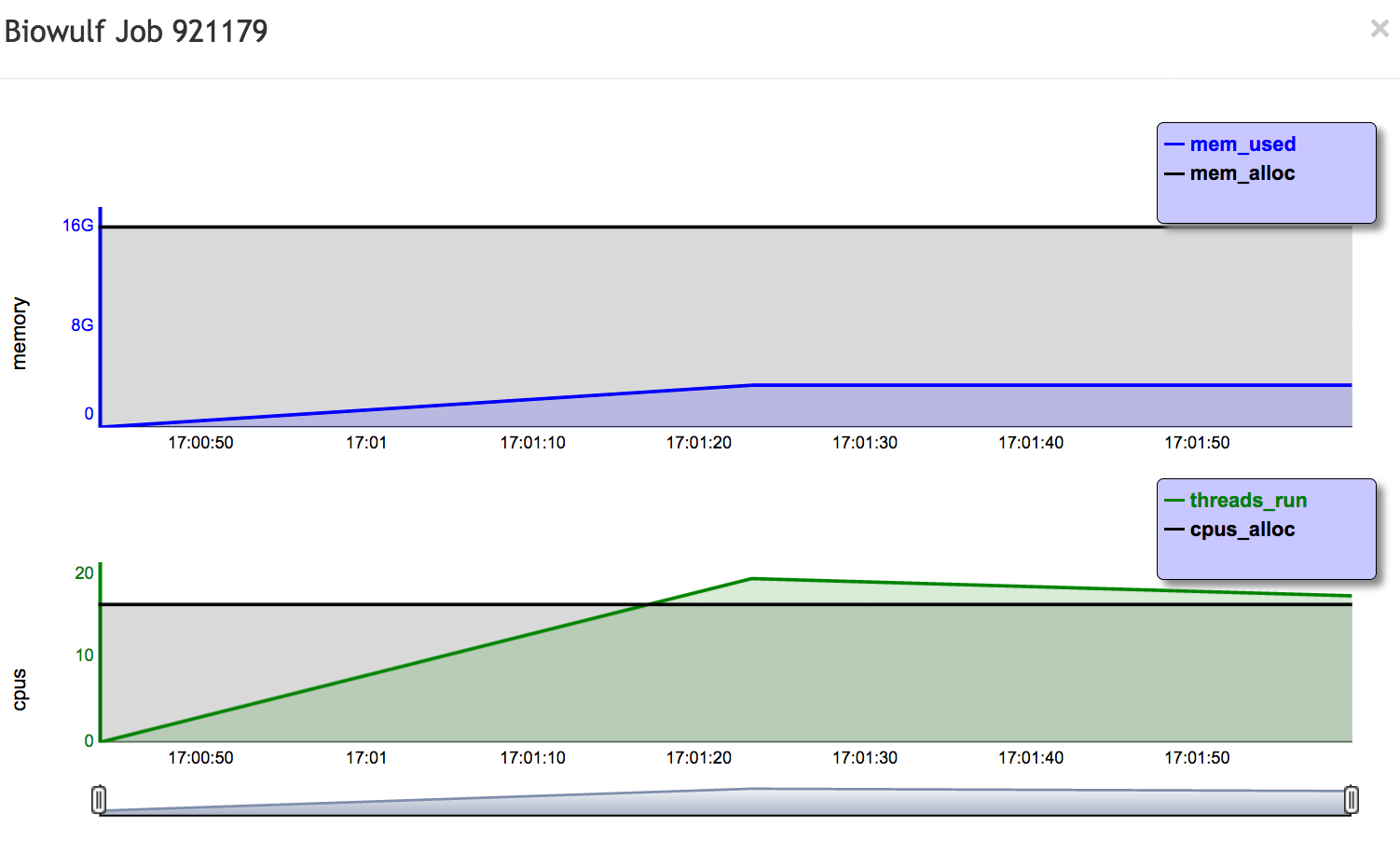 You should see a list of your jobs from the last few days. Click on the job ID of the running or completed bowtie job, and you will see a plot showing the memory and CPU usage of the job. It should look something like this at the end: